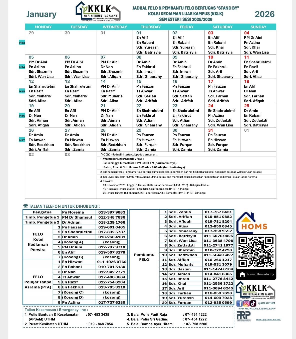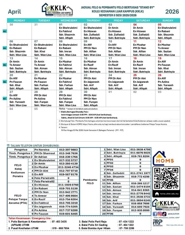 | Felo Kolej Kediaman Perwira | Pn Fauzan | 019-601 6465 |